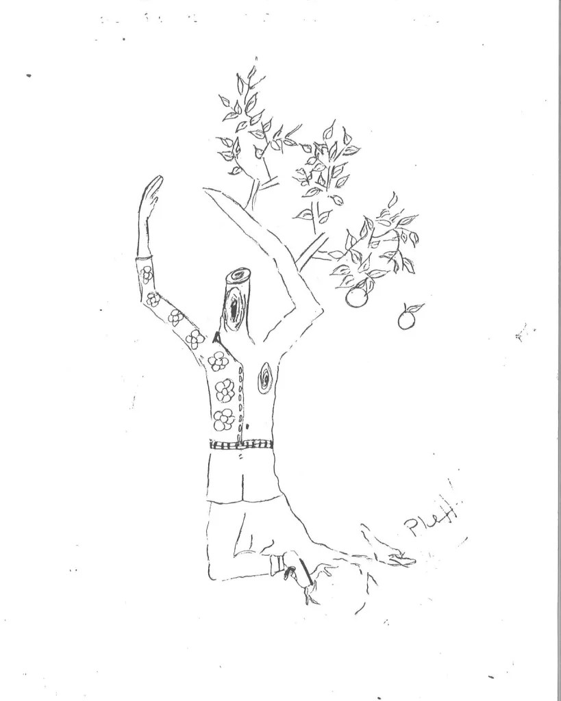 Em cima, desenho de uma menina de 14 anos.