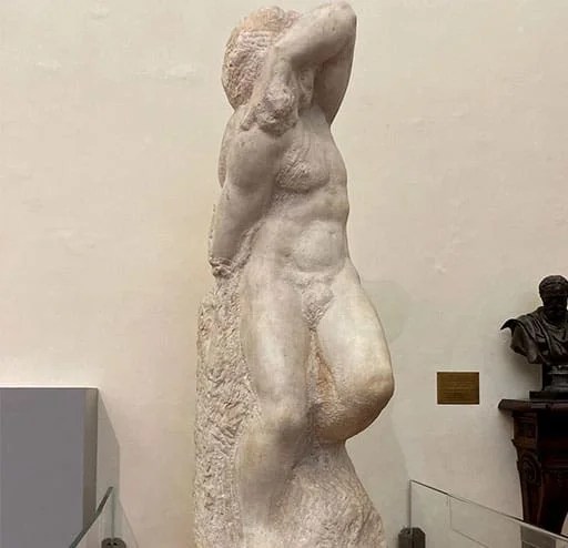 A fotografia faz parte de “Os prisioneiros”(escravos) de Miguel Ângelo. Estas esculturas tinham sido concebidas para o túmulo de Júlio II, mas a obra (do túmulo) sofreu tantas mudanças que ficaram sem destino. Tentavam ser um símbolo da prisão da alma pelo corpo (matéria).